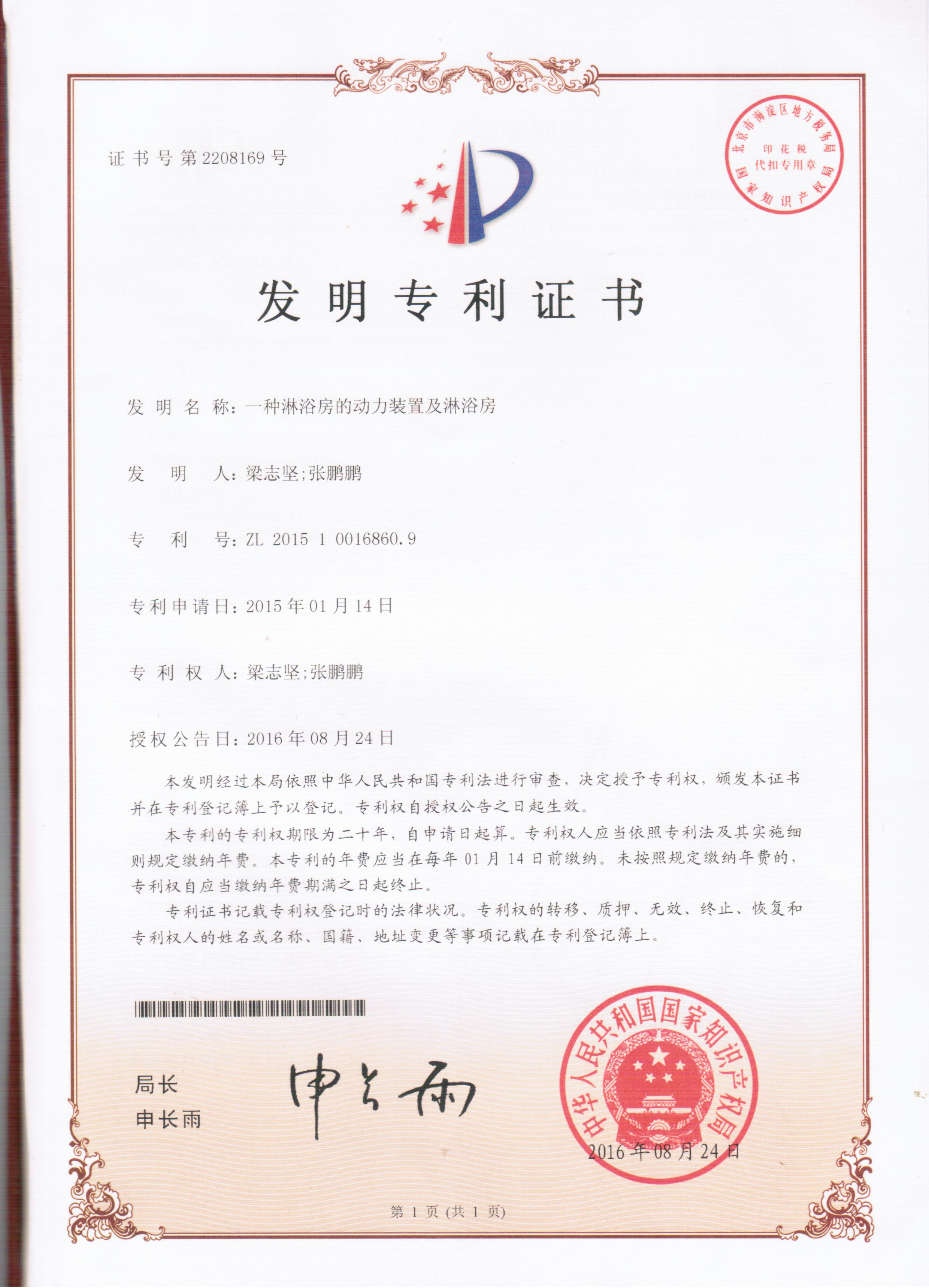 | Имя сертификата: | Power device for shower room and shower room |