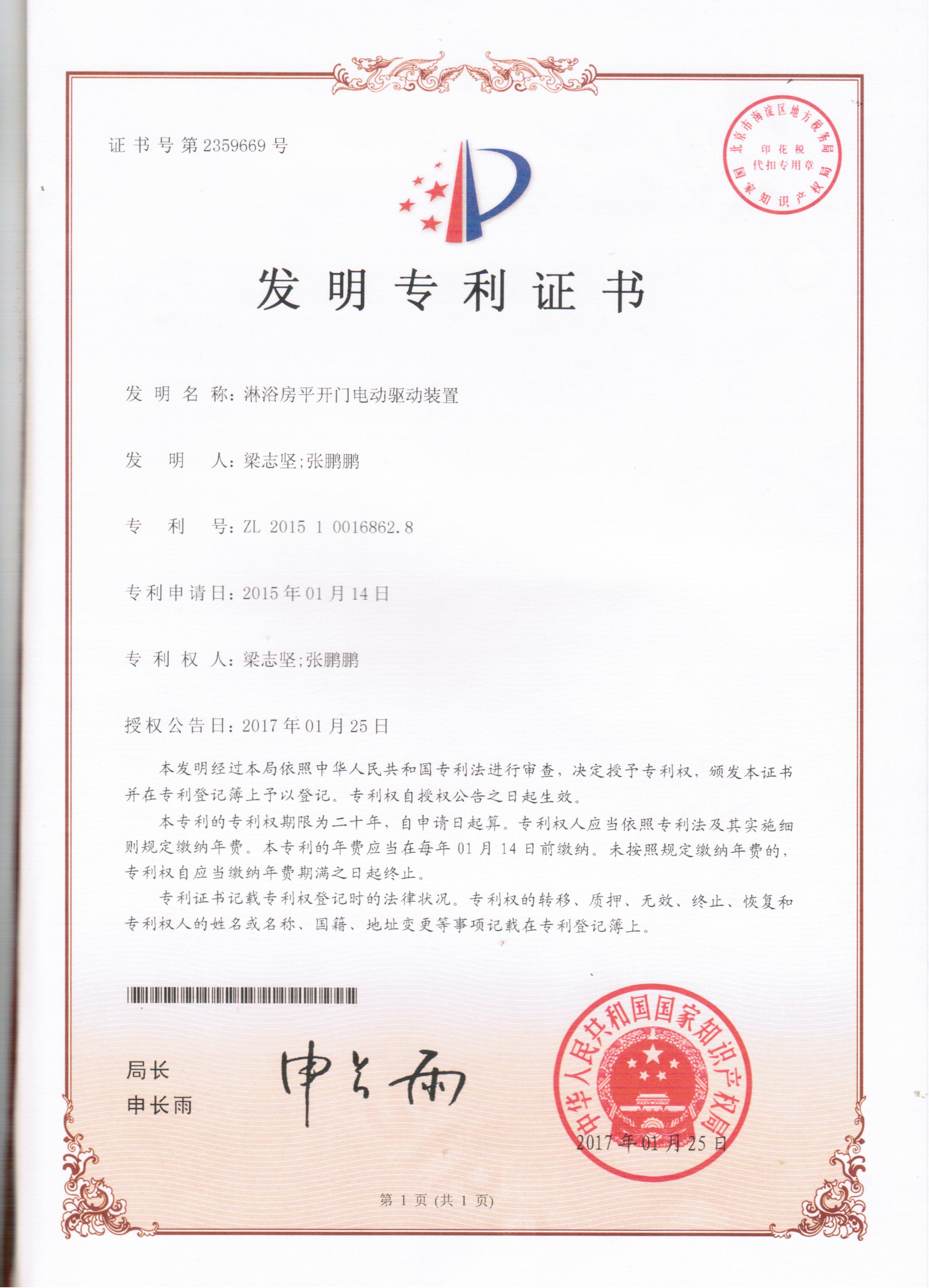 | Имя сертификата: | Electric driving device for sliding door of shower room |