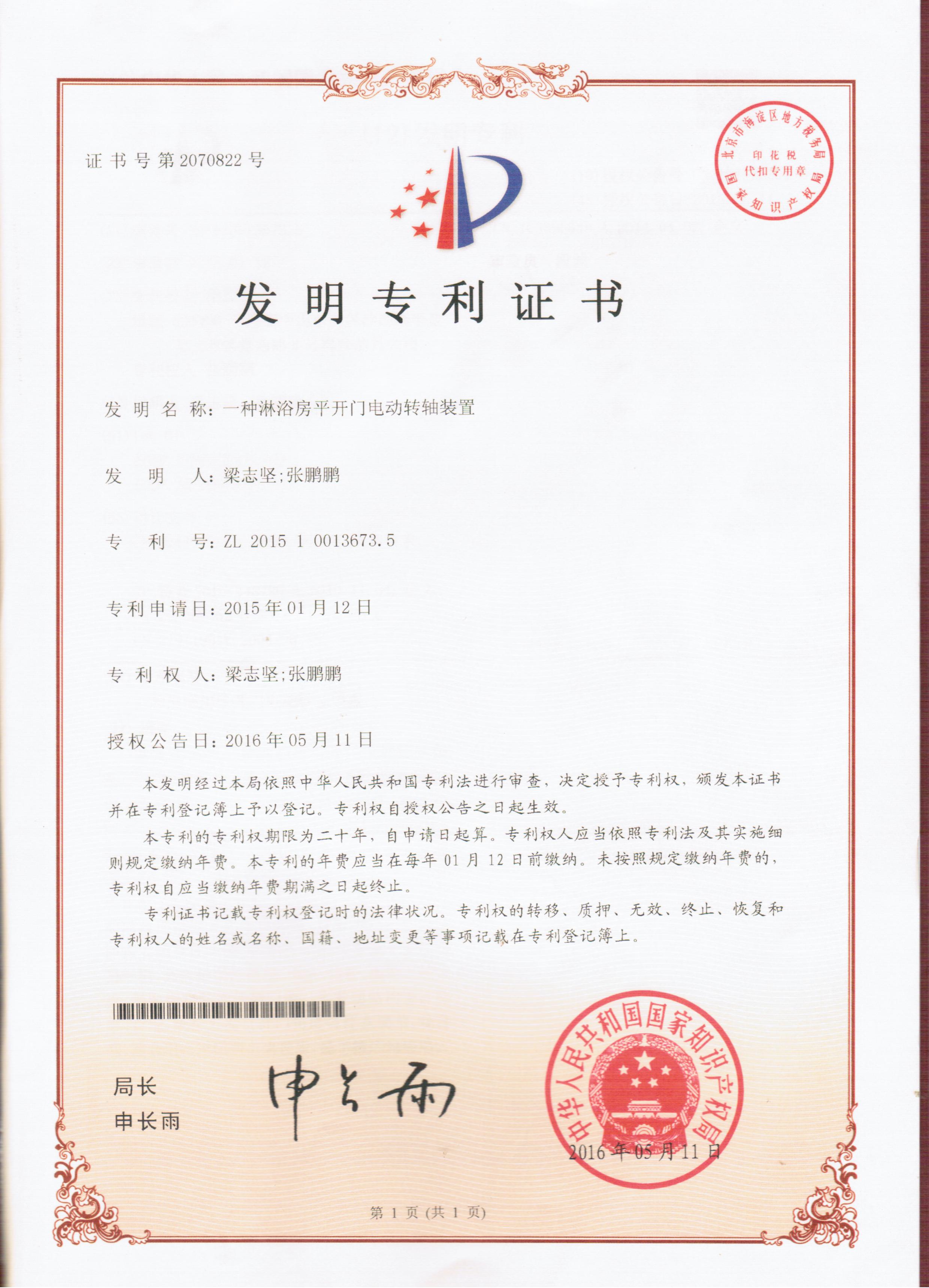 | Имя сертификата: | Electric rotating shaft device for sliding door of shower room |